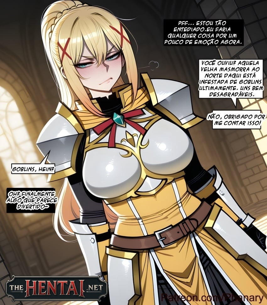 Exclusividade The Hentai: Megumin, uma paladina loira gostosa que só a porra, porém ela tem um atrativo a mais: ela é extremamente masoquista, adora ser insultada por seus colegas de party e chega até a gozar se for muito agredida verbalmente. Assim, a história é que ela está em uma caverna lotada de goblins que avançam em cima dela com um desejo sexual muito forte de gozar dentro da loira peituda. Assim, ela leva tanta rola que não consegue fechar as pernas.