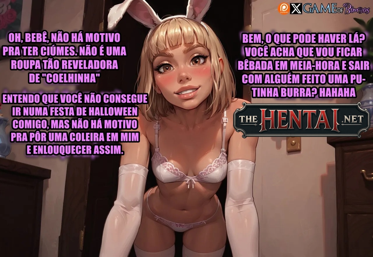 Exclusividade The Hentai: Hentai de traição em que uma garota está indo numa festa à fantasia de Halloween sem a companhia de seu namorado. Ela brinca que não vai beber e sair com algum cara como uma garota putinha e burra, mas usa uma fantasia de coelhinha de playboy e, depois de uns shots de bebida, encontra um negão pra transar. Ela revela pro próprio namorado que já está transando com o negão há tempos, e a partir de agora será namorada do negão. Sobra nada pro Beta.