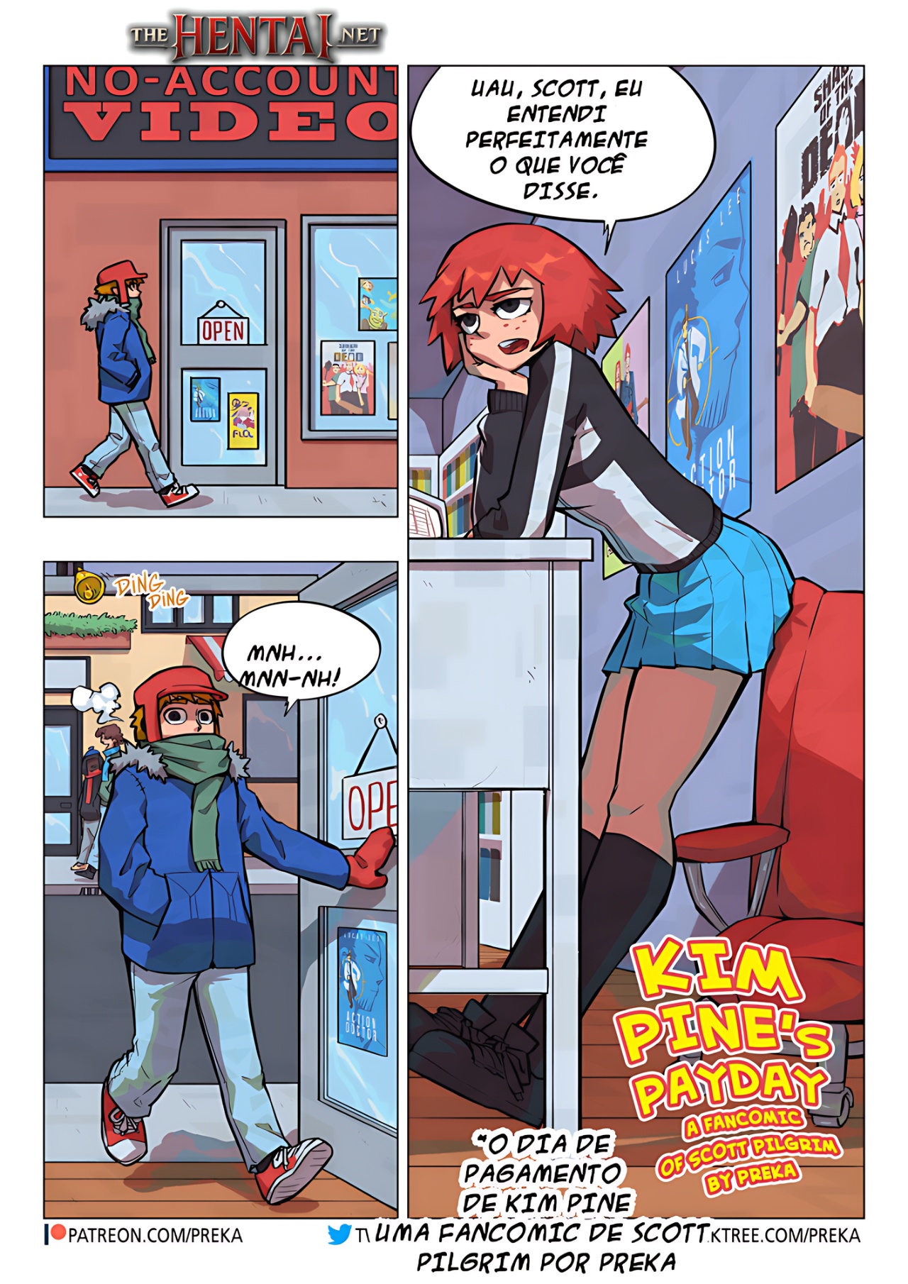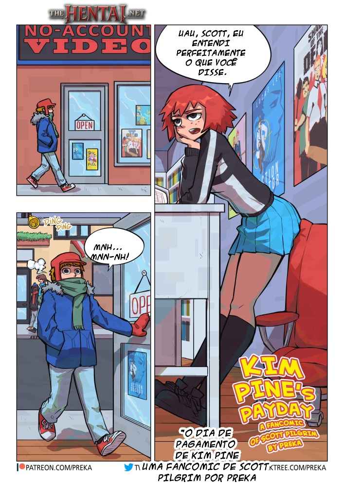 Exclusividade The Hentai: Kim Pine trabalha em uma locadora e está substituindo uma colega sua que está muito doente com um resfriado fudido sem ter condição de trabalhar. Scott Pilgrim está passando pela loja para alugar um filme pornô e devolver outro, porém ele fica com muita vergonha de pedir isso para a amiga dele que está trabalhando. Mas ela é firmeza e ajuda o Scott a alugar o filme. Porém, ele passou tanto tempo com o filme alugado que a multa ficou muito grande e, sem grana, a Kim diz: "É para você pagar, vai ter que me vender esse seu corpo". Na brincadeira, porém, ele não entendeu e ficou de pau duro com a ideia e, por esse mal-entendido, os dois acabam transando.