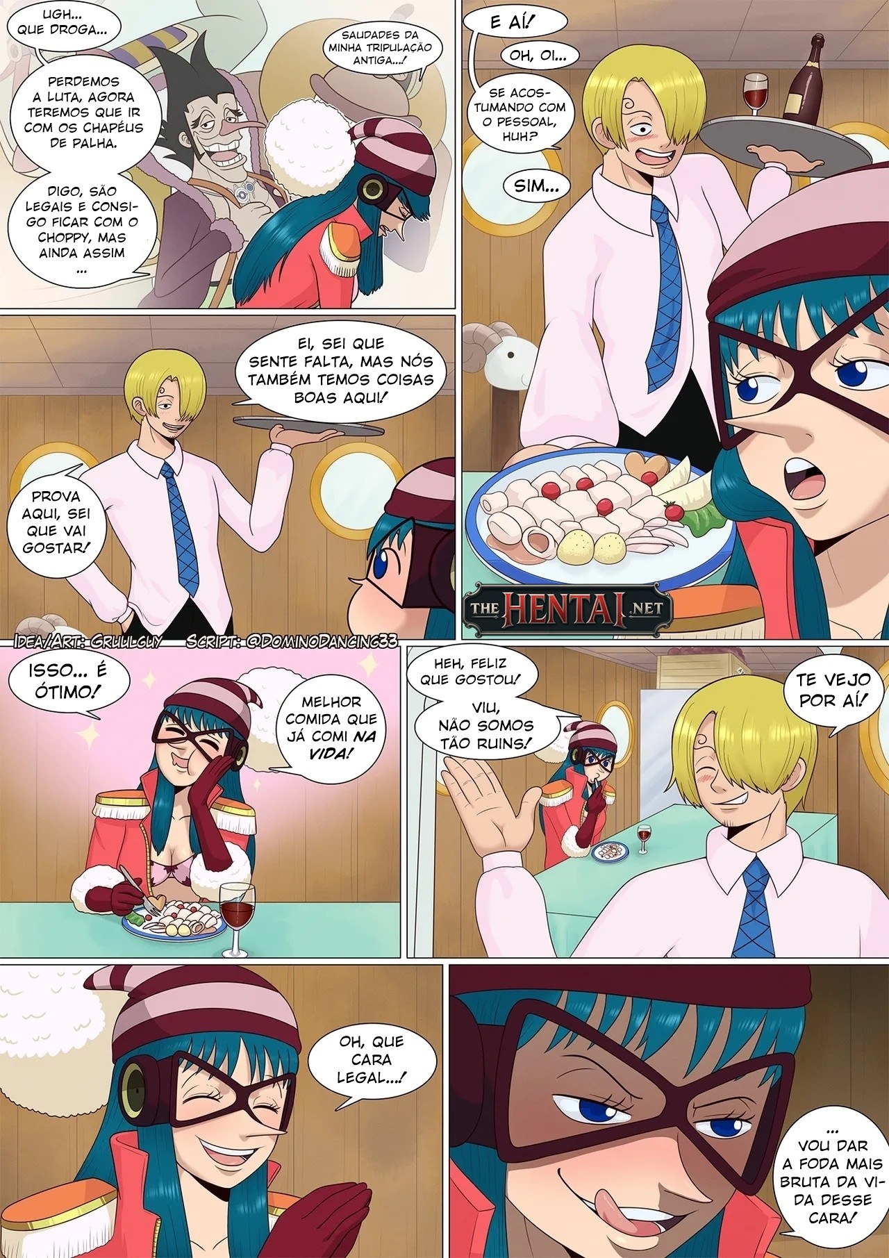 Exclusividade The Hentai: Hentai de One Piece envolvendo a Porche e o Sanji. Aqui acompanhamos a garota com saudades de sua antiga tripulação, incomodada por ter que viajar com os Chapéus de Palha, porém Sanji faz um ato de gentileza ao oferecer uma comida muito gostosa para ela, e para retribuir, ela vai satisfazer sexualmente o cozinheiro do bando, começando por uma mamada e um punhetão.